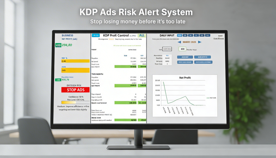 The KDP Profit Dashboard focuses on real financial results, helping authors monitor the relationship between advertising costs, royalties and profit.